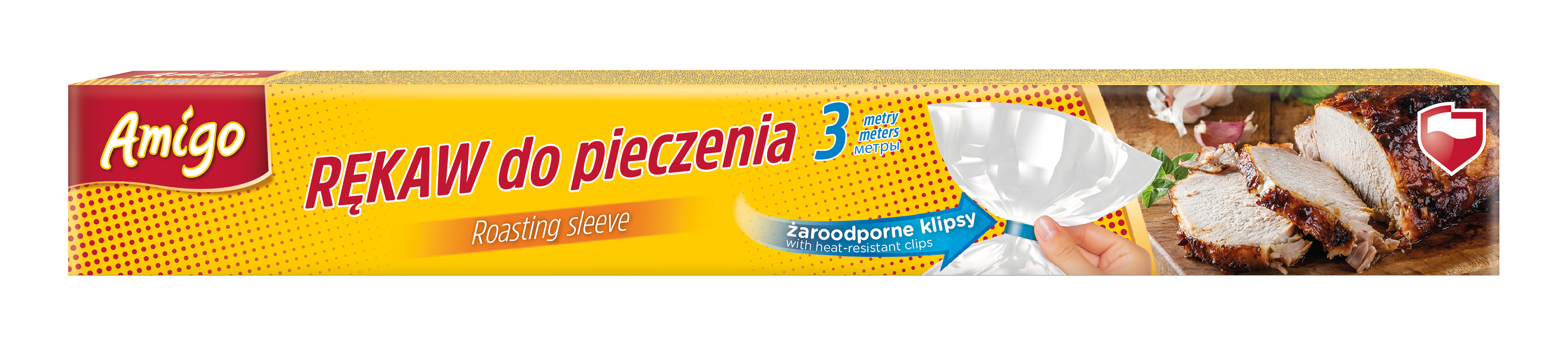 Rękaw do pieczenia Amigo można dopasowywać do wielkości pieczonych potraw. Dzięki temu można w nim wygodnie upiec wielkiego indyka, jak i niewielki kawałek schabu. Pozwala to zapewnić pieczeni najlepsze warunki podczas pieczenia i sprawia, że potraw nabierze wspaniałego smaku.