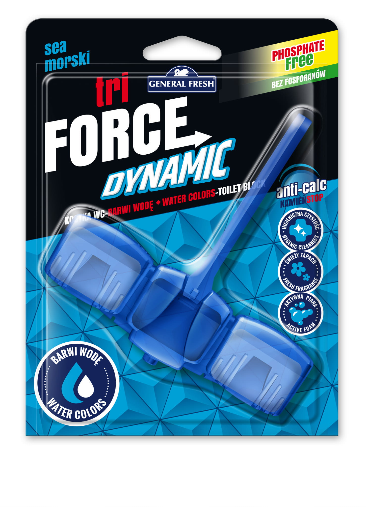 Zawieszka do WC barwiąca wodę — Tri Force Dynamic zadba z potrójną siłą o nieskazitelną czystość w toalecie. Dzięki eliminującej kamień technologii anti-calc oraz aktywnej pianie usuwa zanieczyszczenia, gromadzące się w muszli klozetowej.