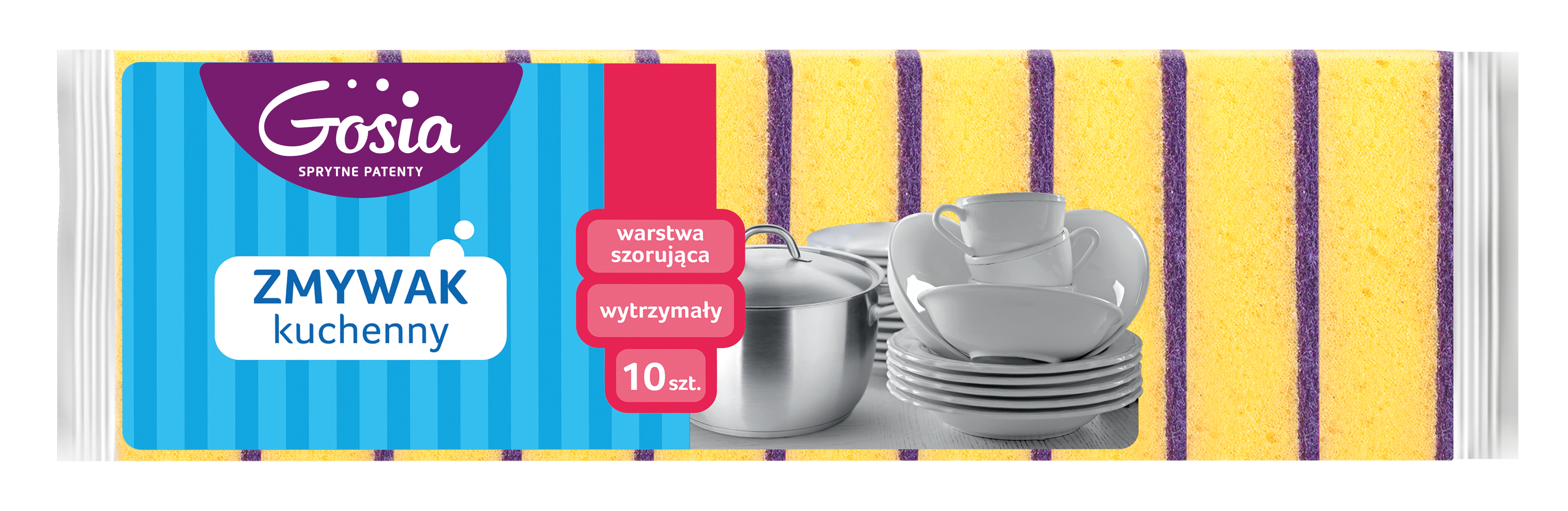 Jest to produkt bardzo wytrzymały i wygodny w użytkowaniu. Ma też wyrazisty, żółty kolor. Twardsza strona gąbki służy do wstępnego zmywania największego brudu i resztek, a gąbczastą spienisz płyn do naczyń i dokładnie wypolerujesz naczynia.