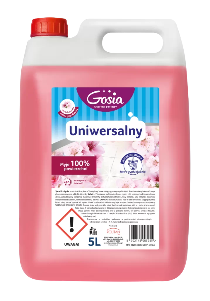 Płyn uniwersalny do mycia podłóg marki Gosia o zapachu kwiatu japońskiej wiśni skutecznie czyści wszelkiego rodzaju powierzchnie, takie jak podłogi z drewna lakierowanego, PCV, linoleum, gumoleum, terakota, marmur, kamień, lastryko oraz płytki ceramiczne. Pozostawia delikatny, kwiatowy zapach świeżości, nie pozostawia smug ani zacieków i nie tworzy lepkiej warstwy na umytej powierzchni.