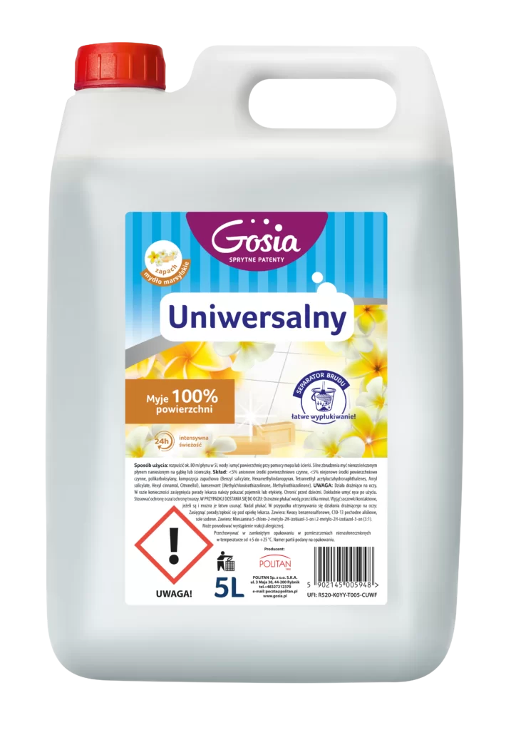 Płyn uniwersalny do mycia podłóg marki Gosia o zapachu mydła marsylskiego skutecznie czyści wszelkiego rodzaju powierzchnie, takie jak podłogi z drewna lakierowanego, PCV, linoleum, gumoleum, terakota, marmur, kamień, lastryko oraz płytki ceramiczne. Pozostawia przyjemny, świeży zapach czystości, nie pozostawia smug ani zacieków i nie tworzy lepkiej warstwy na umytej powierzchni.