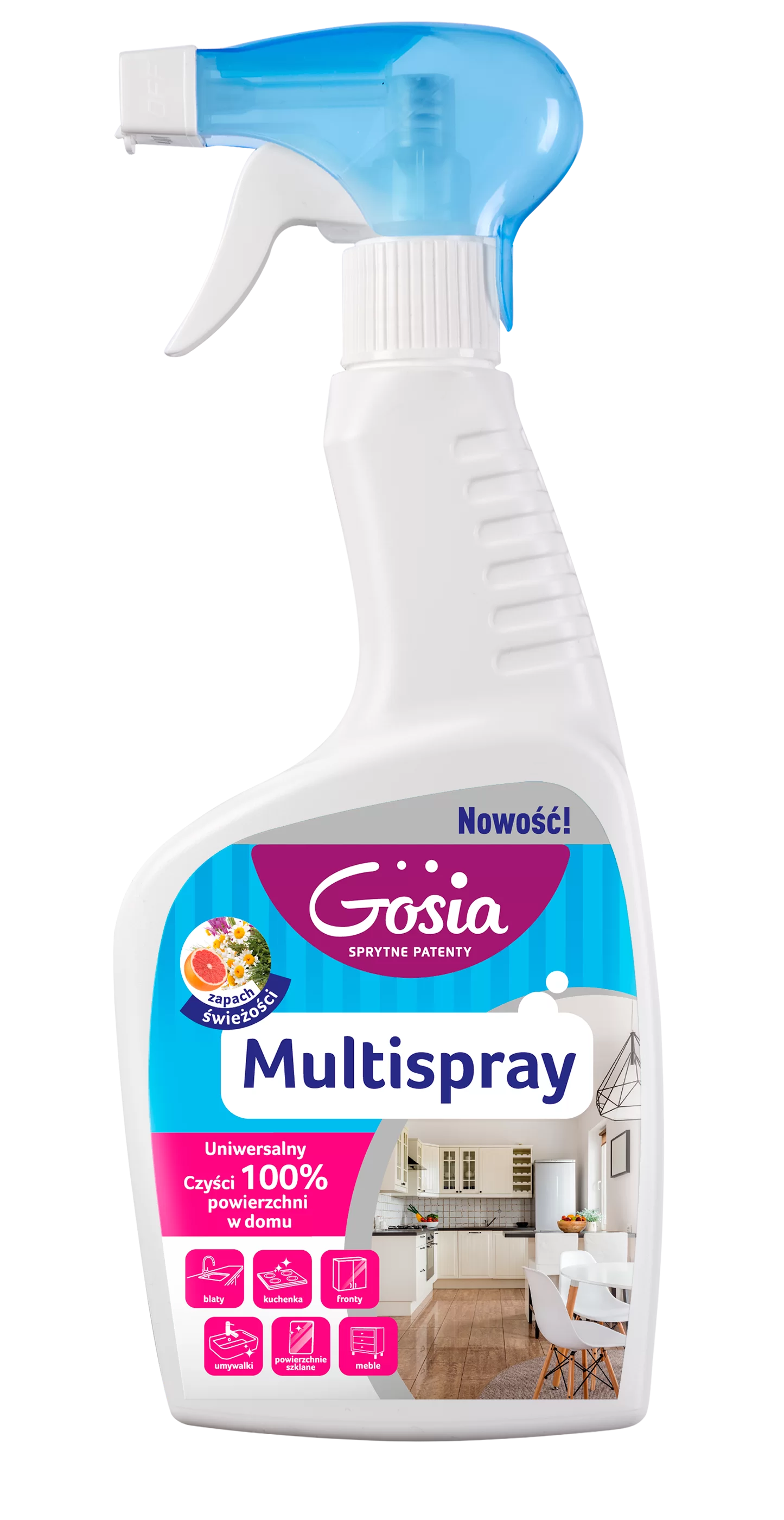 Płyn Multispray marki Gosia to uniwersalny środek czyszczący, który ułatwia codzienne sprzątanie i pozostawia w domu przyjemny zapach oraz świeżość. Dzięki swojej wszechstronności doskonale radzi sobie z różnorodnymi zabrudzeniami — od kurzu po tłuszcz. Specjalna formuła została opracowana tak, aby nie pozostawiać smug na czyszczonych powierzchniach, także na powierzchniach szklanych — zapewnia im nieskazitelny połysk.