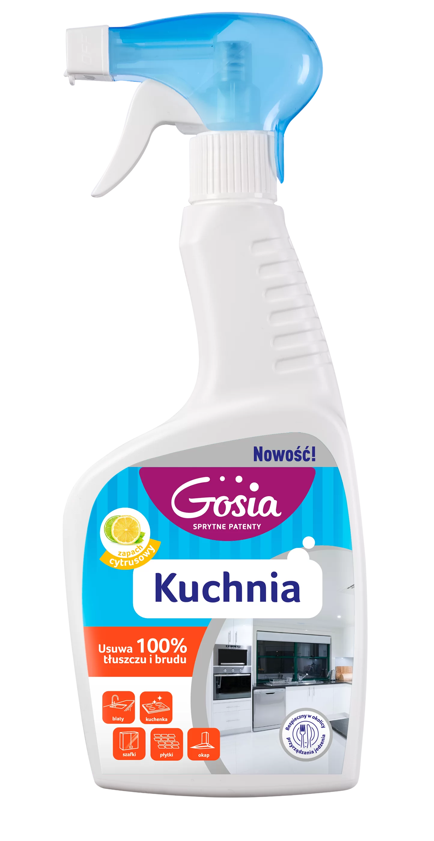Płyn do kuchni marki Gosia to skuteczny preparat przeznaczony do codziennego czyszczenia powierzchni kuchennych. Dzięki formule skoncentrowanej na usuwaniu tłuszczu, brudu i resztek jedzenia, pozwala szybko przywrócić czystość i higienę na blatach, kuchence, szafkach, płytkach oraz okapie. Użycie jako spray lub pianka umożliwia dopasowanie sposobu aplikacji do powierzchni i stopnia zabrudzenia. Produkt jest bezpieczny do stosowania w miejscach przygotowywania żywności, także przez osoby o wrażliwej skórze.