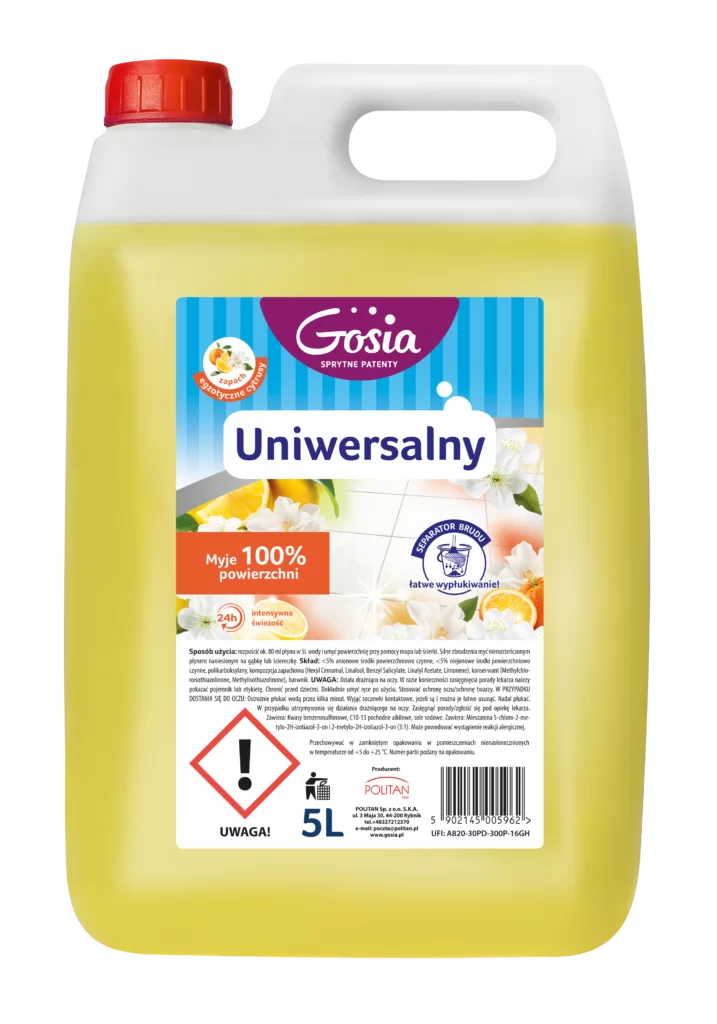 Płyn uniwersalny do mycia podłóg marki Gosia o zapachu egzotycznych cytrusów skutecznie czyści wszelkiego rodzaju powierzchnie, takie jak podłogi z drewna lakierowanego, PCV, linoleum, gumoleum, terakota, marmur, kamień, lastryko oraz płytki ceramiczne. Pozostawia intensywną świeżość i czystość bez smug i zacieków, nie tworząc lepkiej warstwy na umytej powierzchni.