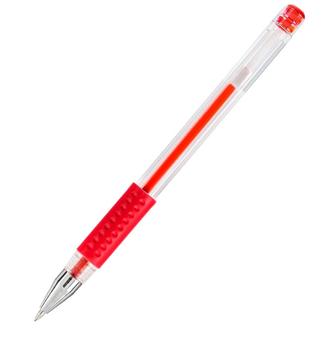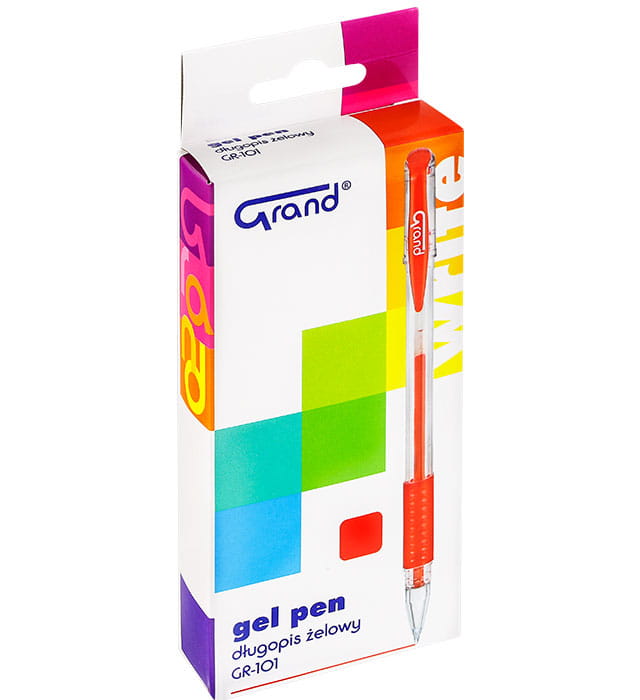 Długopis żelowy Gr - 101 w kolorze czerwonym na wymienne wkłady, posiada przezroczystą obudowę ułatwiającą kontrolę zużycia tuszu.