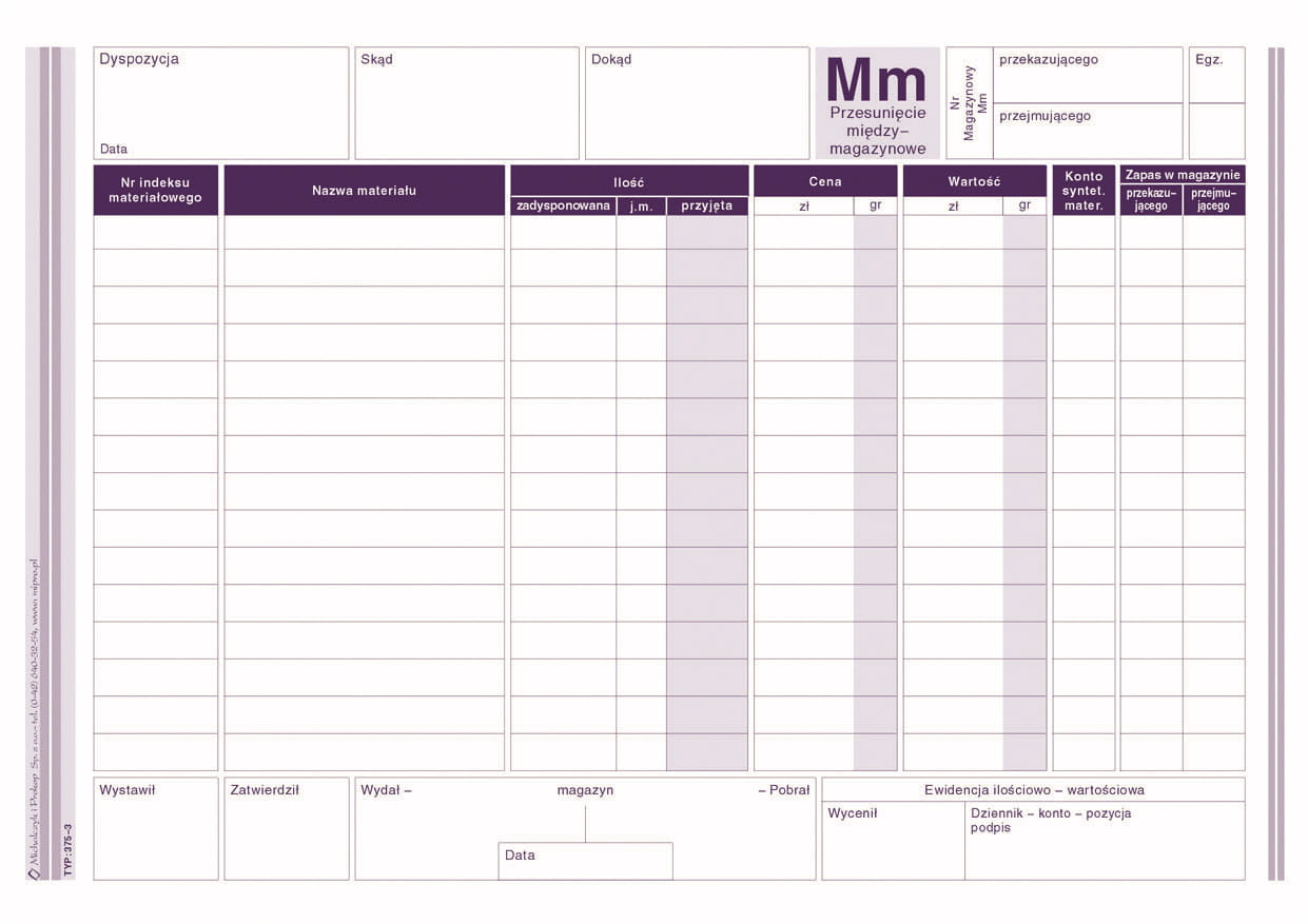 Druk dotyczący przesunięcia między magazynowego (Mm), obrotu towarowego i materiałowego. Papier samokopiujący, jednostronny. Bloczek ma 80 kartek.