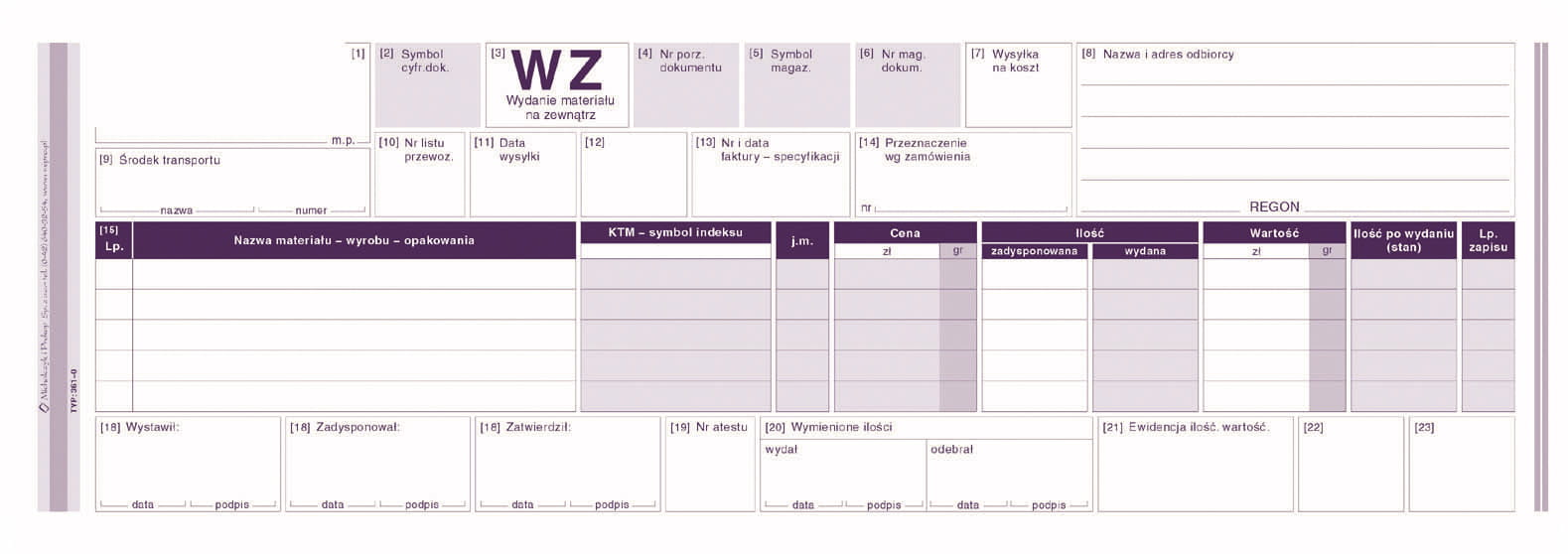 Druk wydania materiału na zewnątrz (WZ). Format 1/2 A4. Samokopiujący papier, jednostronny. Bloczek: 80 kartek.