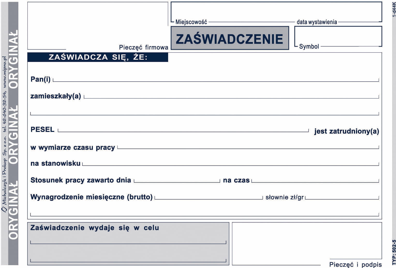 Druk zaświadczenie o zatrudnieniu w formacie A6. Papier samokopiujący, jednostronny (oryginał + kopia). Bloczek 80 kartkowy.