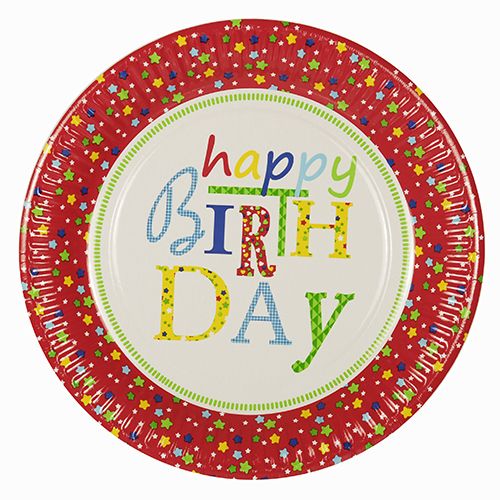 Papstar — 10 szt. — talerze papierowe "Happy Birthday" fi 23 cm