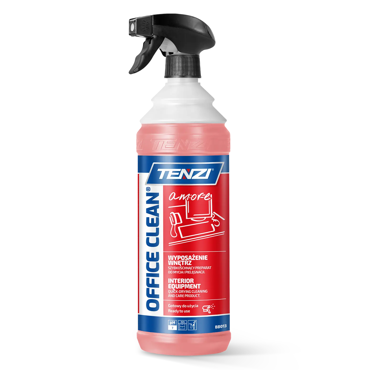 TENZI Office Clean Amore to gotowy do użycia, neutralny preparat ogólnego przeznaczenia, który nie pozostawia smug, szybko wysycha i nie uszkadza powierzchni. Idealny do wyposażenia biur, mieszkań, szkła, laminatów, drewna lakierowanego oraz urządzeń wyposażenia wnętrz.