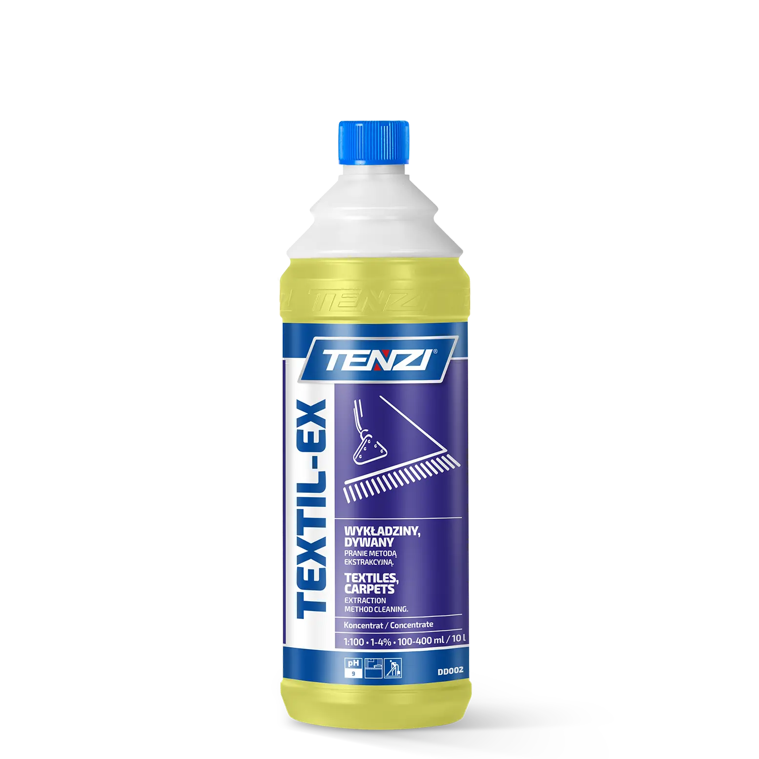 TENZI Textil-Ex to wysokiej jakości środek do prania tkanin techniką ekstrakcyjną, przeznaczony do wykładzin, dywanów i tapicerki. Nie zawiera wybielaczy optycznych ani rozpuszczalników, jest niskopieniący i głęboko penetruje włókna, wydobywając brud na zewnątrz i ułatwiając jego usunięcie.