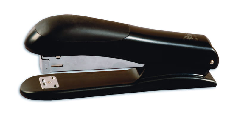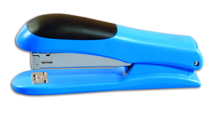 Zszywacz w obudowie z tworzywa sztucznego, części mechaniczne metalowe. Zszywanie zamknięte i otwarte.